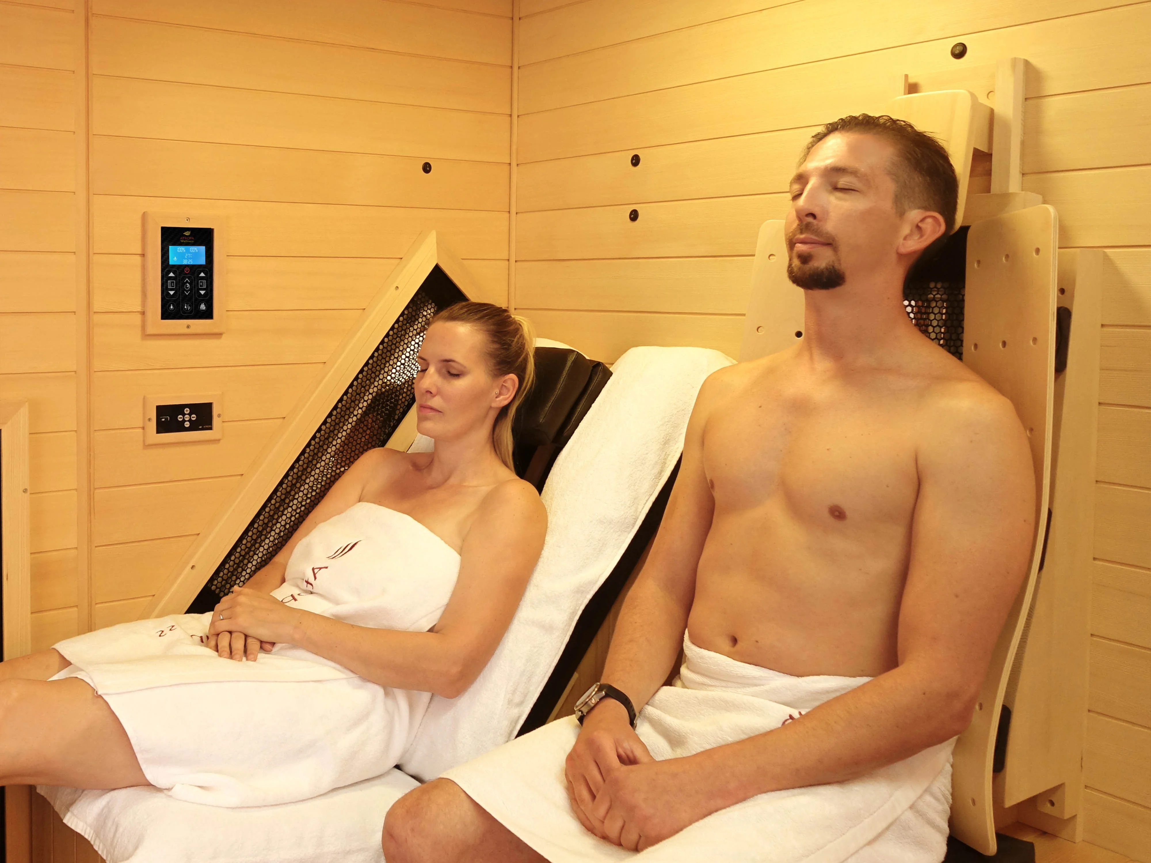 Beispiel: Ihre Freundin hat von Ihrer ATROPA Infrarotkabine erfahren und ist begeistert. Sie gehen einmal in der Woche zusammen infrarot-saunieren. Mit einem einzigen Tastendruck werden ihre Lieblingseinstellungen geladen, sodass Sie sich sofort ihrem Gespräch widmen und gemeinsam entspannen können.