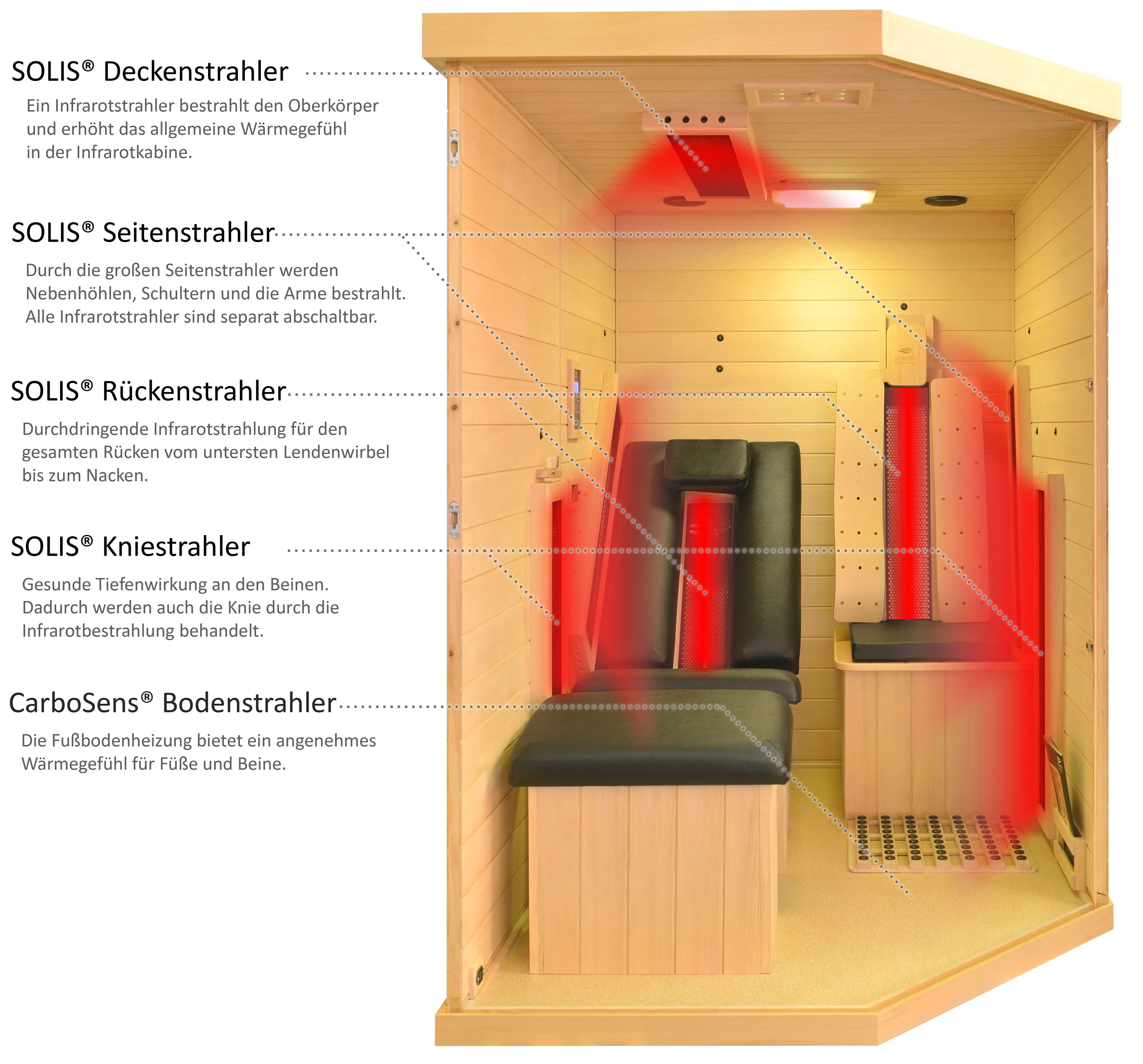 Der Sitz verfügt ebenfalls zwei SOLIS® Tiefenwärme-Infrarotstrahler für den Rücken- und Schulterbereich und einen SOLIS® Tiefenwärme-Infrarotstrahler für die Knie. Am Fußboden ist ein CarboSens® Flächenstrahler eingebaut.