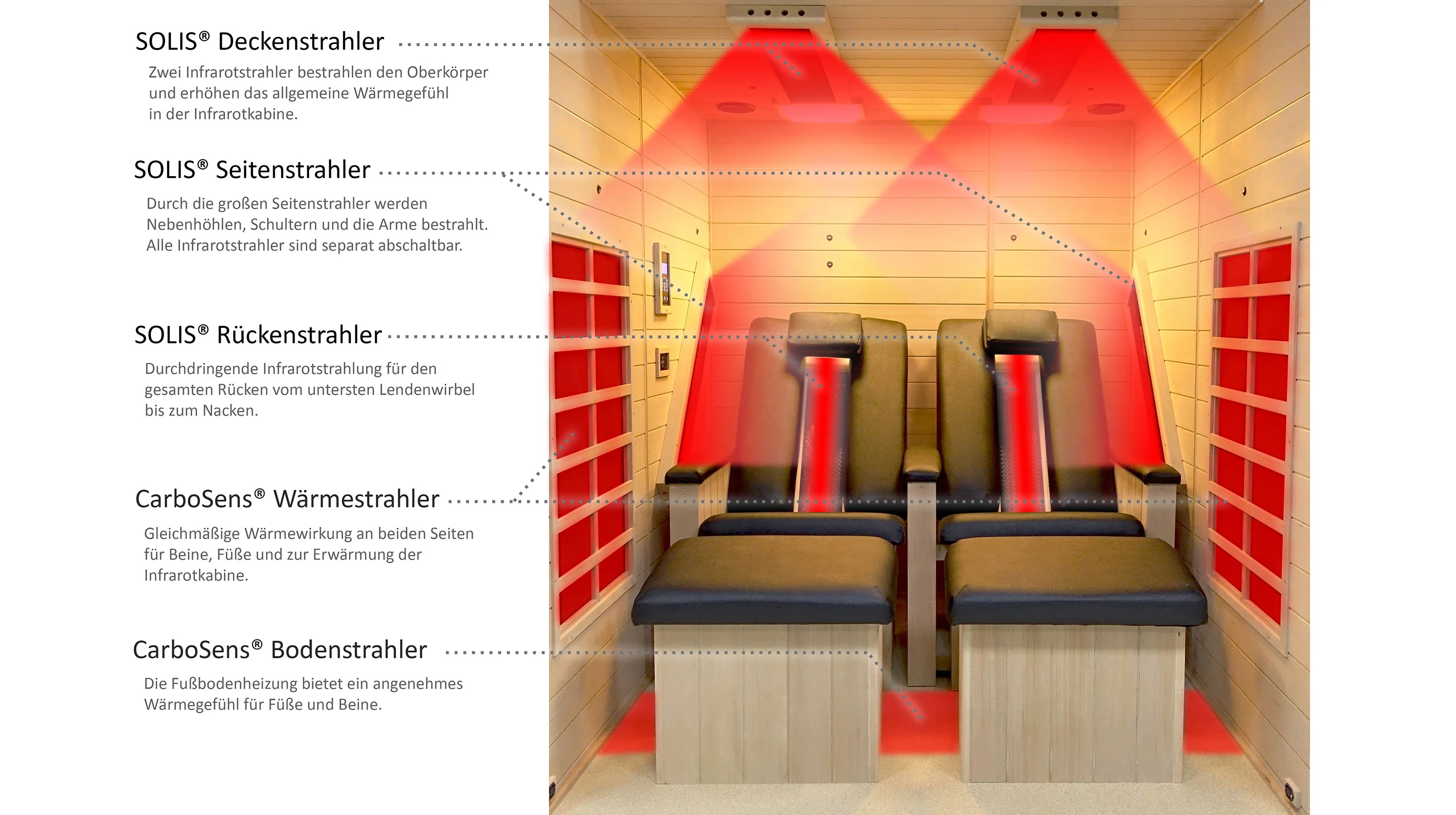 Auch das Platzangebot in der Kabine wurde erhöht, sodass Sie bei gemeinsamer Anwendung genügend eigenen Raum haben und nicht mit dem Partner physisch in Berührung kommen. Lassen Sie nach einem stressigen Arbeitstag einfach los und entspannen Sie bei einer rundum Infrarotbestrahlung mit unseren bewährten SOLIS® Tiefenwärmestrahler und Carbosens® Flächenstrahler. Das Arrangement dieser hochwertig konzipierten Infrarotstrahler wurde perfekt an die Bedürfnisse des menschlichen Körpers und der jeweiligen Körperpartien angepasst.