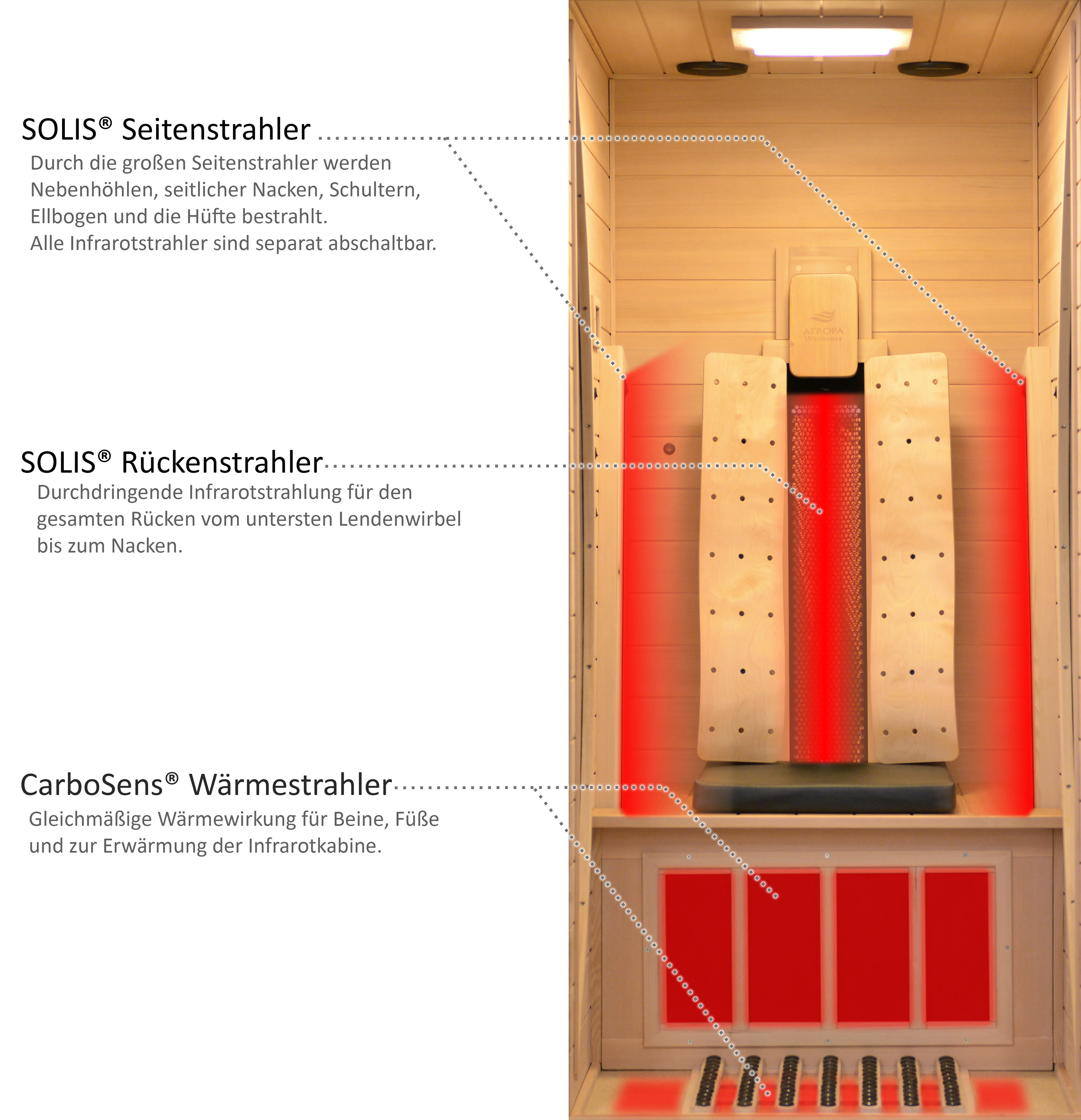 In der neuen Infrarotkabine ATR - 1 finden Sie 4 SOLIS® Tiefenwärme-Infrarotstrahler der 4. Generation. Es handelt sich hierbei um Keramik-Magnesiumoxid-Stabstrahler mit weißer Sandfüllung, welche eine gleichmäßige und intensive IR-B- und IR-C Bestrahlung gewährleisten.