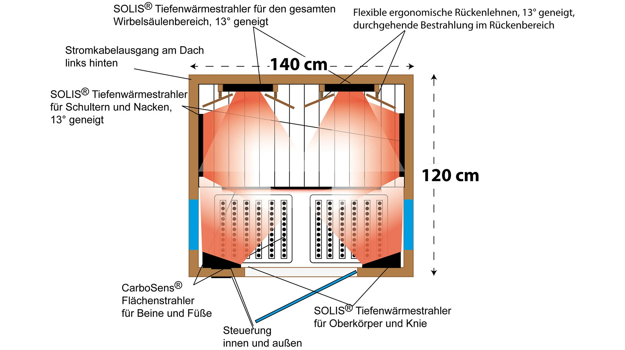 Die 13° geneigten Schulterstrahler ermöglichen eine hervorragende Bestrahlung von den Seiten, damit auch der seitliche Nacken, die Schultern, Ellenbogen sowie die Hüfte ganzheitlich durchwärmt werden. Die seitlichen SOLIS® Tiefenwärmestrahler sind so positioniert, dass die Tiefenwärme bereits auf der Höhe der Sitzbank beginnt und bis hinauf zum Nacken reicht, um keine Problemzone auszulassen. Um auch eine effektive Bestrahlung von vorne zu gewährlieisten, wurden die vorderen Infrarotstrahler ebenfalls zum Körper hin schräg ausgerichtet. Die Frontstrahler zeigen in der ATR-2 XL somit mittig zum Oberkörper, dadurch wird eine effektive Tiefenwirkung für die Knie und Oberkörper erzielt.