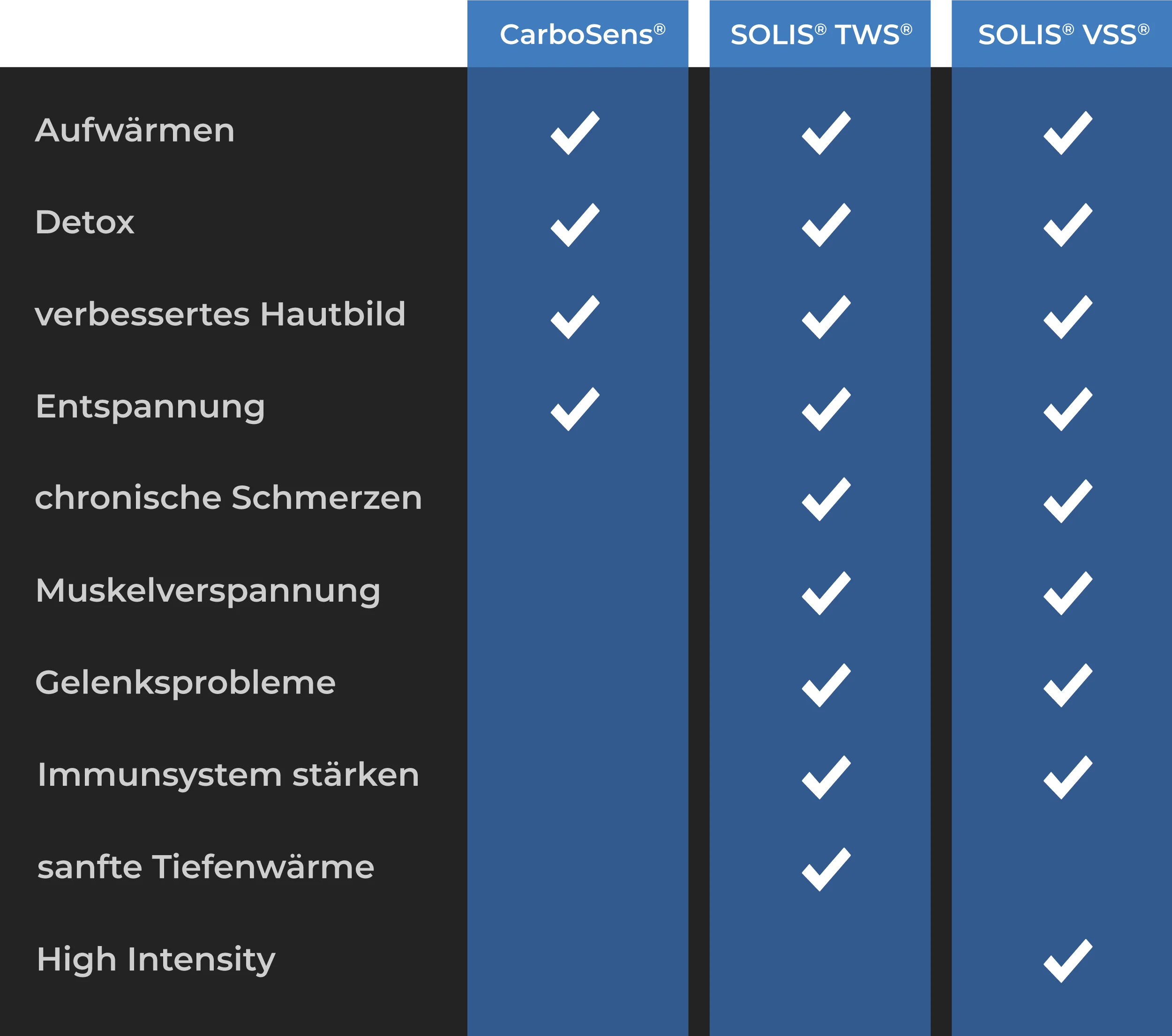 Wer schnelle Tiefenwärme mit hoher Intensität sucht, wählt jedenfalls unseren SOLIS® VSS® Vollspektrumstrahler. Hier dringen die infraroten Wärmestrahlen erstaunlich tief ins Gewebe ein, ohne zu überbelasten.