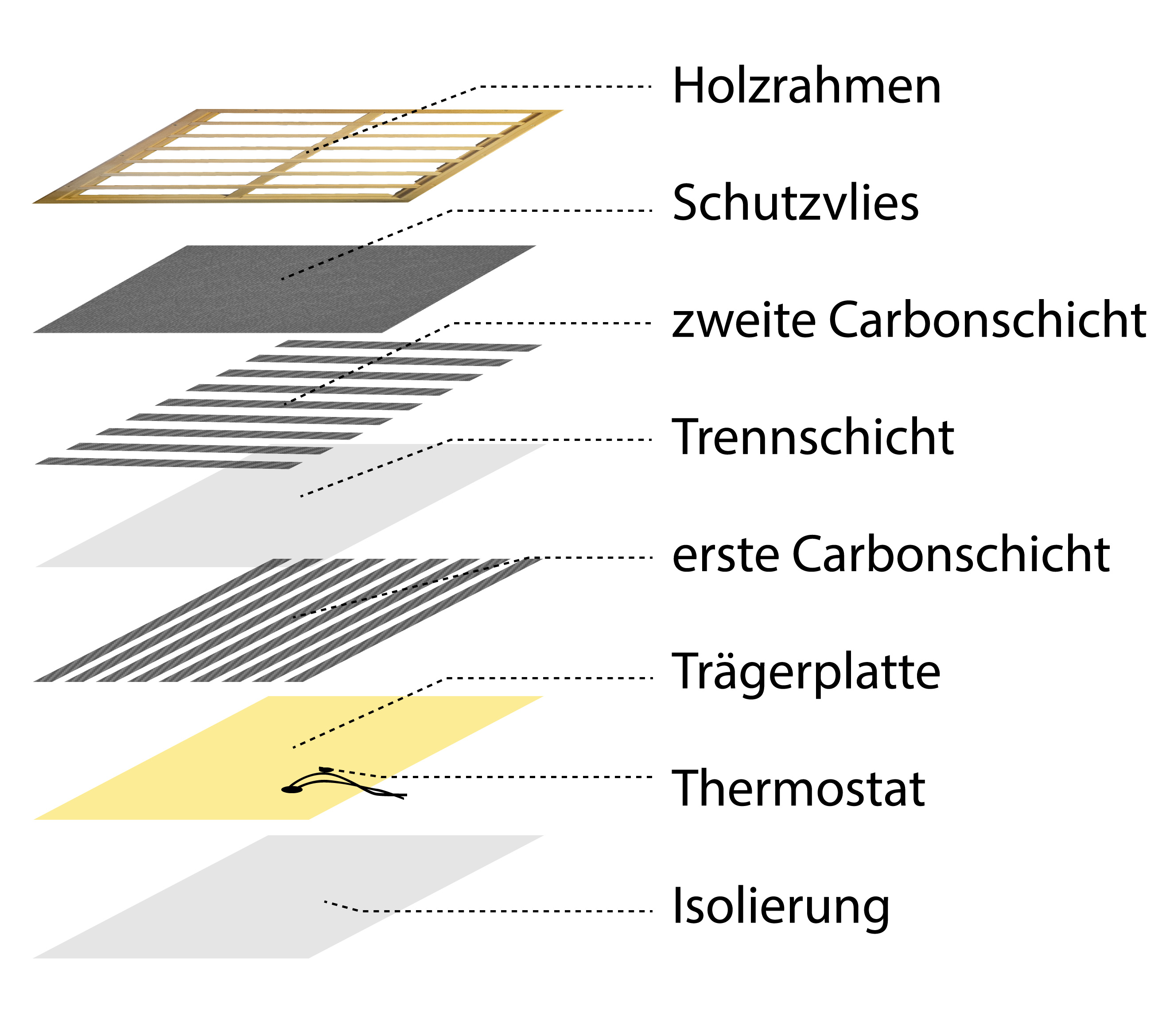 Auf die stablilen Trägerplatte werden die Cabonschichten aufgetragen. Aber auch die elektrischen Anschlüsse sowie das strahlerinterne Thermostat befinden sich auf der Trägerplatte. Das Thermostat regelt die maximale Aufheiztemperatur des jeweiligen CarboSens® Flächenstrahlers. Somit sind einerseits die Maße und Anzahl der Carbonbahnen und andererseits die Thermostatkonfiguration maßgeblich für die Wärmeabgabe des Flächenwärmestrahlers.