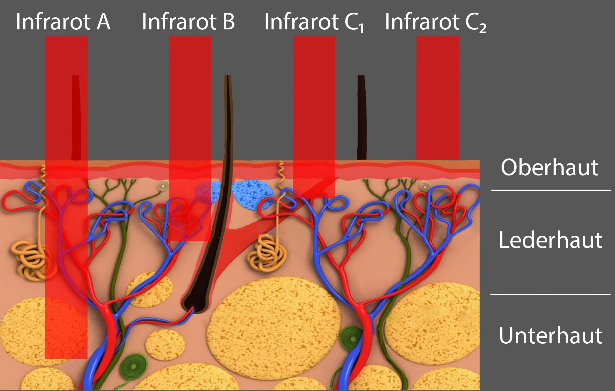 Je nach Strahlungsart dringt die Infrarotstrahlung unterschiedlich tief in die Haut ein. Dabei dringt Infrarot A bis zu 5 mm ein, Infrarot B bis zu 1,5 mm und Infrarot C1 bis zu 0,5 mm. IR-C2 wird bereits von der Hautoberfläche vollständig absorbiert.