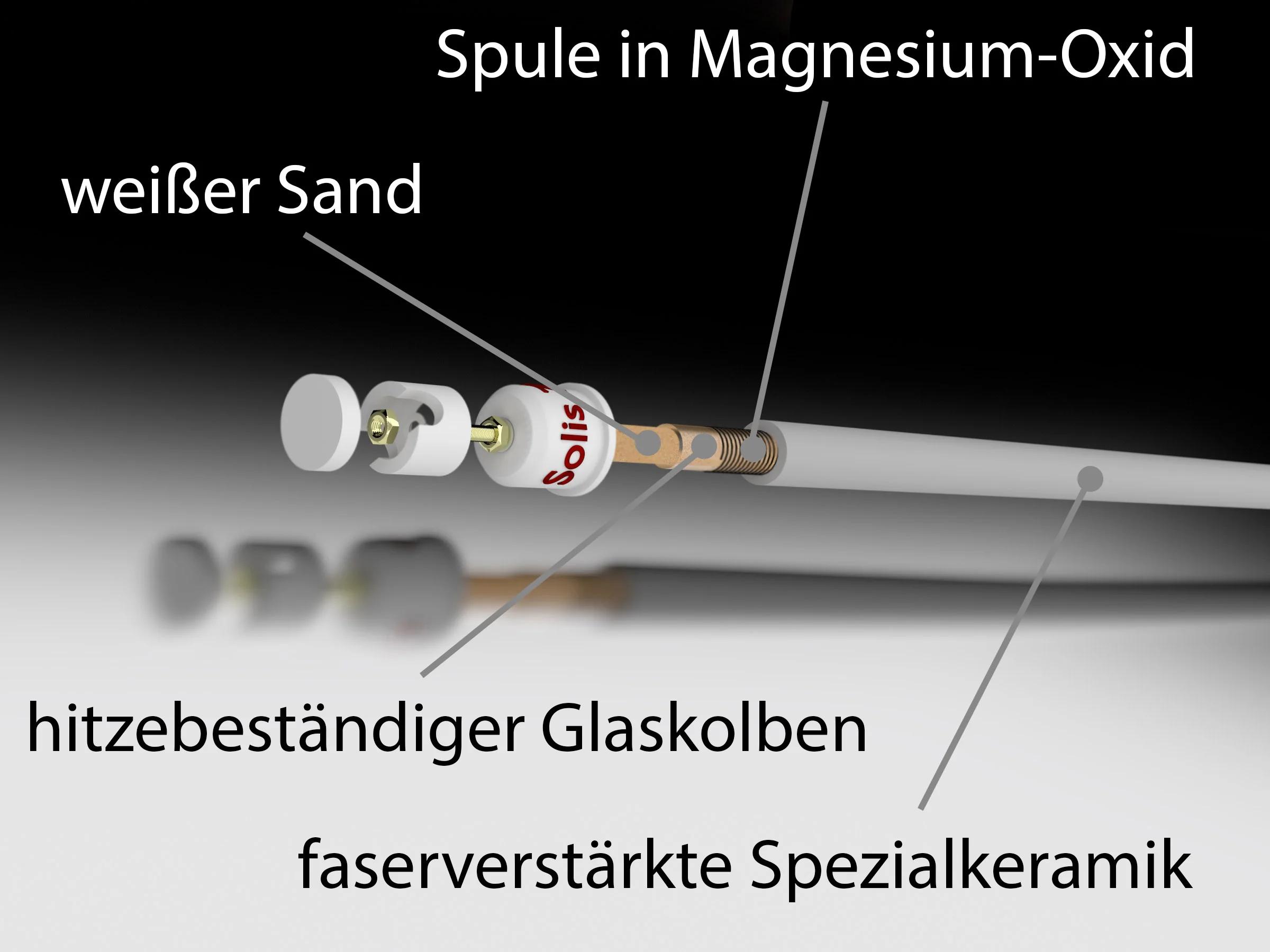 Umhüllt ist der Glaskolben von einem in Magnesiumoxid (Magnesia) eingebetteten Heizdraht aus einer Chrom-Nickel-Legierung, die selbst extremsten Temperaturen ohne Degradation oder Korrosion standhält. NiCr-Legierungen sind der Goldstandard für Heizelemente und stehen für höchste Qualität und Zuverlässigkeit. Das Magnesiumoxid stellt dabei das Trenn- und Wärmeleitmittel dar.