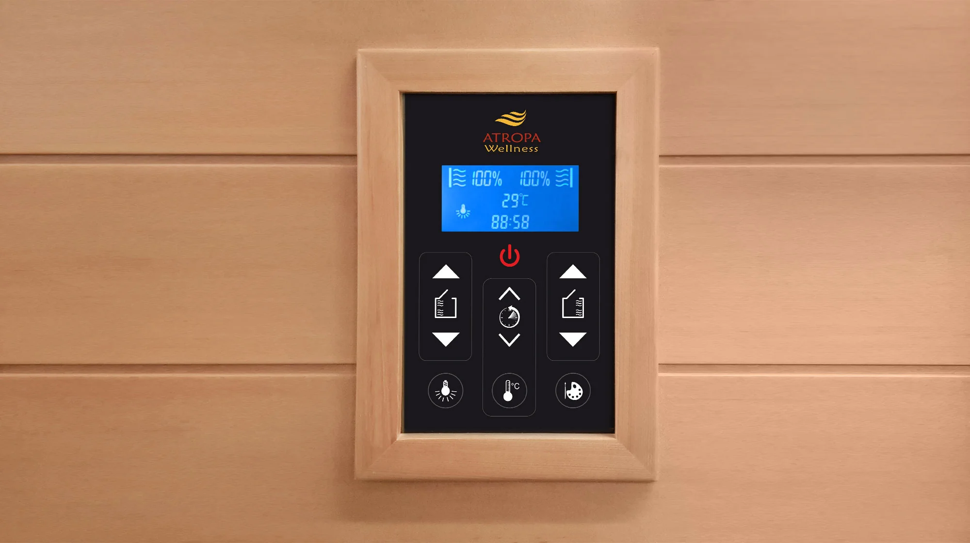 Die Bedienung der Infrarotkabine erfolgt einfach und intuitiv über das Hochglanzdisplay. Dabei ist es möglich, auch während der Anwendung die gewünschte Temperatur, die individuelle Strahlerintensität (linke und rechte Seite getrennt regulierbar), die Restlaufzeit oder auch die Lichtoptionen zu ändern. Dies geschieht einfach per Tastendruck auf das jeweilige Symbol. Die Anzeige der Einstellungen erfolgt dabei prompt und direkt auf der LCD-Anzeige.