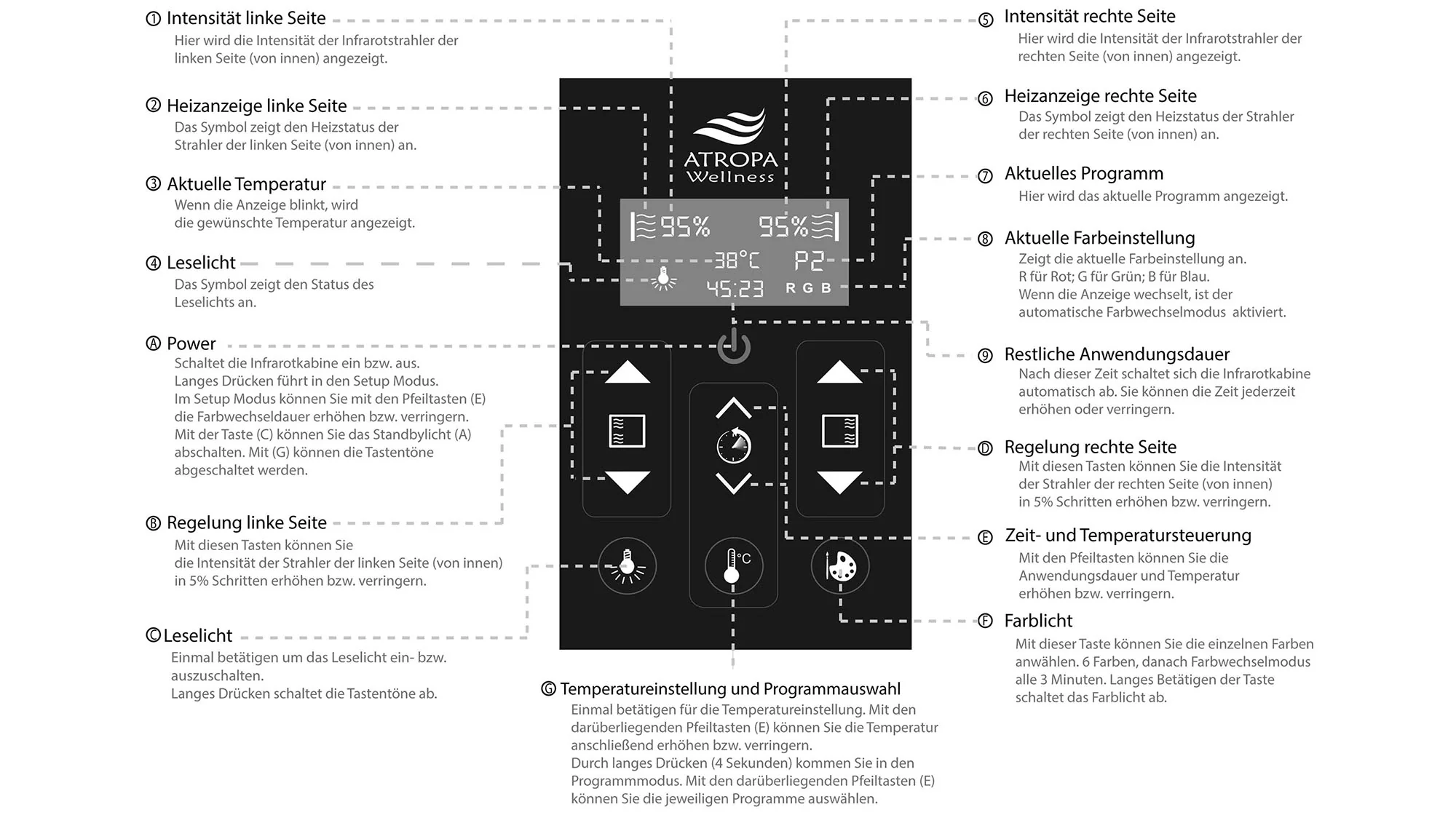 Die Steuerung der Infrarotkabine erfolgt mittels Tastendruck auf das Touch-Display innen und außen oder per Fernbedienung. Dabei sind folgende Einstellungen möglich: