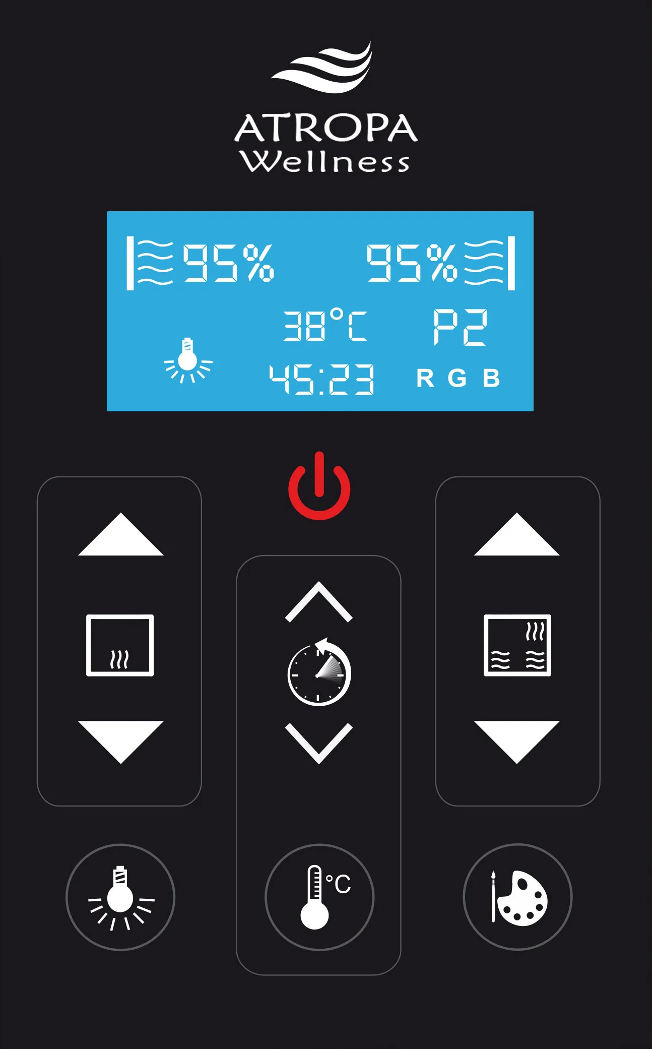 Die Bedienung der Infrarotkabine erfolgt einfach und intuitiv über das Hochglanzdisplay. Dabei ist es möglich, auch während der Anwendung die gewünschte Temperatur, die individuelle Strahlerintensität (linke und rechte Seite getrennt regelbar), die Restlaufzeit oder auch die Lichtoptionen zu ändern. Dies geschieht einfach per Tastendruck auf das jeweilige Symbol. Die Anzeige der Einstellungen erfolgt dabei prompt und direkt auf der LCD-Anzeige.