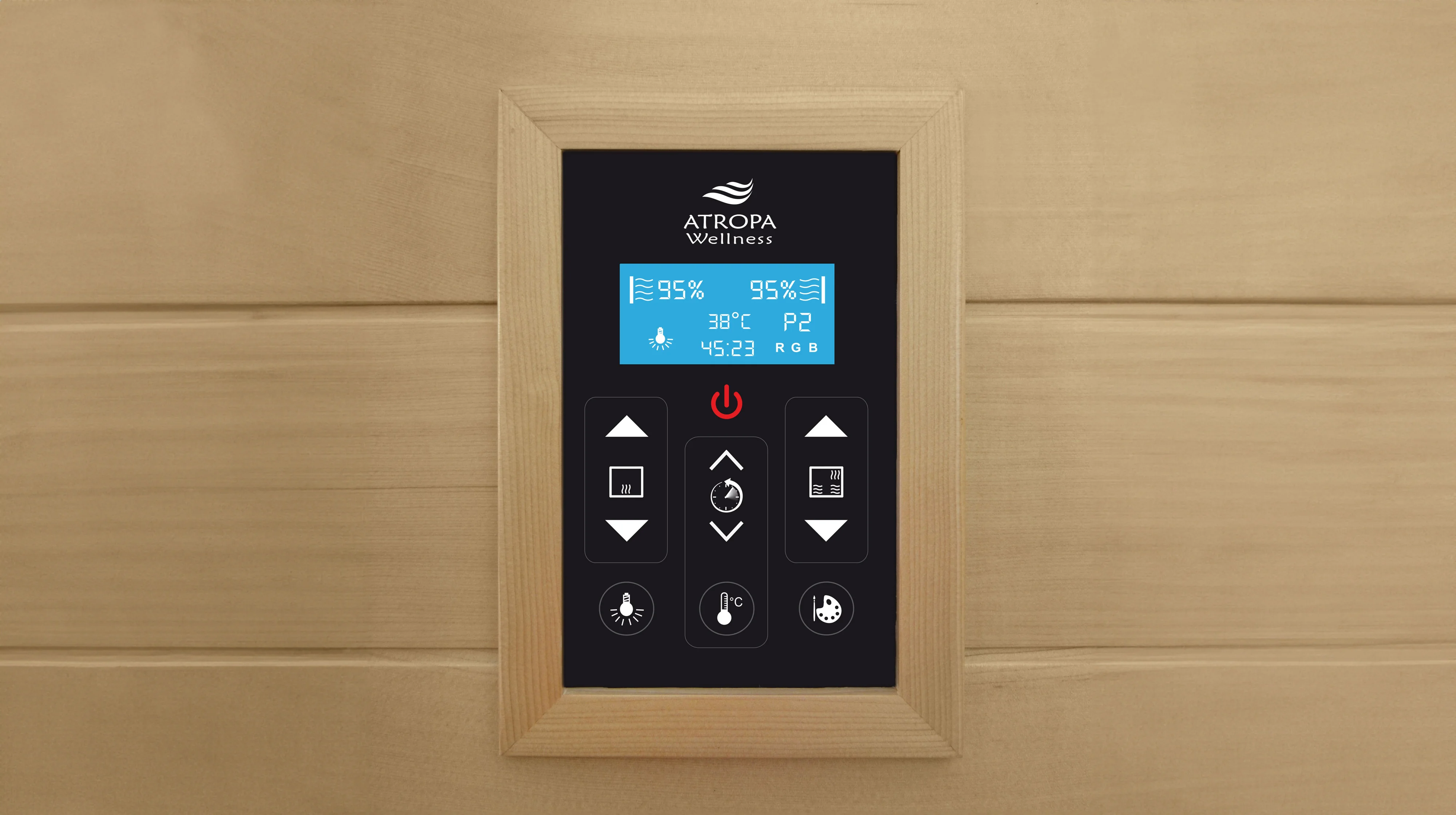 Die Steuerung der Infrarotkabine erfolgt mittels Tastendruck auf das Touch-Display innen und außen oder per Fernbedienung. Dabei sind folgende Einstellungen möglich:
