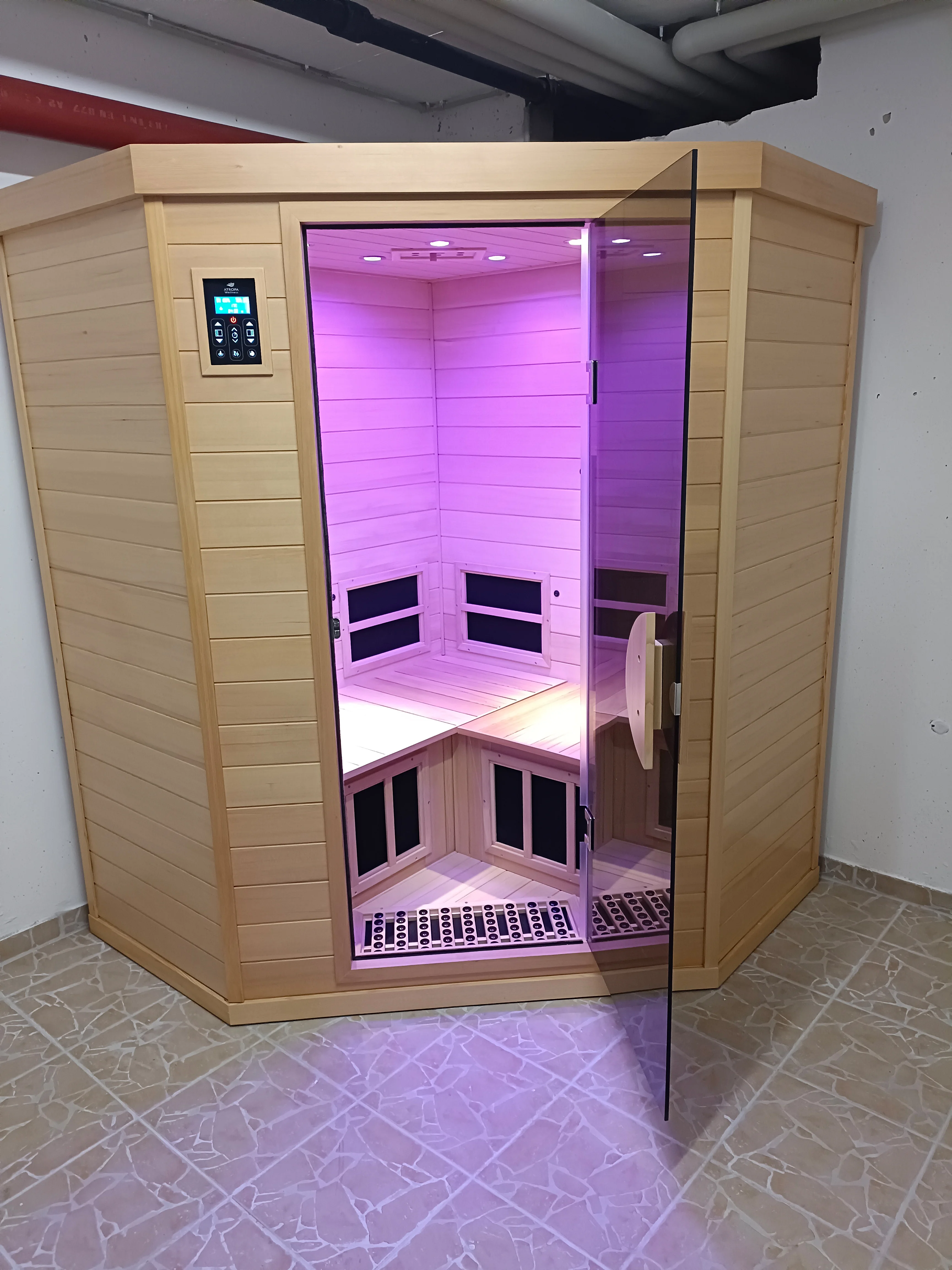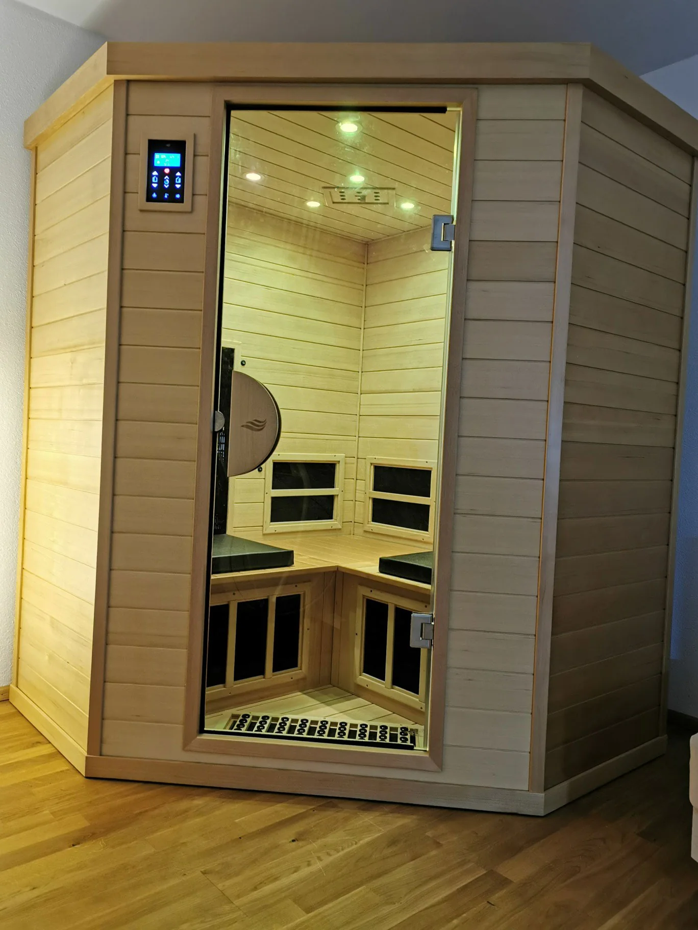 Webseite ist sehr gut aufgebaut. Modellübersicht und detaillierte Informationen in PDF Format zu den unterschiedlichen Infrarotkabinen ist sehr hilfreich bei der Auswahl des Produkts. Bestellung wurde telefonisch durchgeführt und verlief unkompliziert. Infrarotkabine war nach Bezahlung innerhalb von 5 Werktagen angeliefert. Alle Teile wurden auf einer Euro Palette angeliefert, wobei beim Auspacken zu achten ist, dass die Teile gestützt werden damit sie nicht auseinander fallen. Bei der Montage werden zwei Personen für den Transport von Fußboden, Seitenteile, Tür und Decke benötigt. Die anderen Teile können alleine getragen werden. Der Aufbau kann größtenteils alleine erfolgen. Bei einigen Tätigkeiten (Seitenwand, Tür, Decke) wird eine zweite Person benötigt. Zu beachten ist, dass beim Aufbau der Eckkabine die Zugänglichkeit rundum gegeben ist, um nachträglich die Stecker an der Decke montieren zu können (Bild). Die beigefügte Montageanleitung ist leicht zu lesen. Der Aufbau anhand der Montageanleitung ist unkompliziert und für einen Selbstaufbau geeignet. Es entsteht sehr viel Müll, besonders Karton und Styropor, auf Grund des Verpackungsmaterials. Benötigte 5 gelbe Säcke für die Entsorgung der Styroporteile. Hier wäre Verbesserungspotential vorhanden. Die Benützung der Infrarotkabine ist super. Wärmestrahlung ist sehr angenehm und es wird auch eine angenehme Temperatur erreicht. Die Programme sind gerade für Einsteiger hilfreich. Die Programmierung der Family Funktion ist etwas gewöhnungsbedürftig. Könnte einfacher sein. Beim Produkt waren kleine leichte Beschädigungen an der unbehandelten Holzoberfläche vorhanden. Aber es ist halt Holz und stört auch nicht. Ausbesserung mit Schleifpapier ist kein Problem. Würde beim nächsten Kauf auf jeden Fall wieder auf das Produkt zurückgreifen.