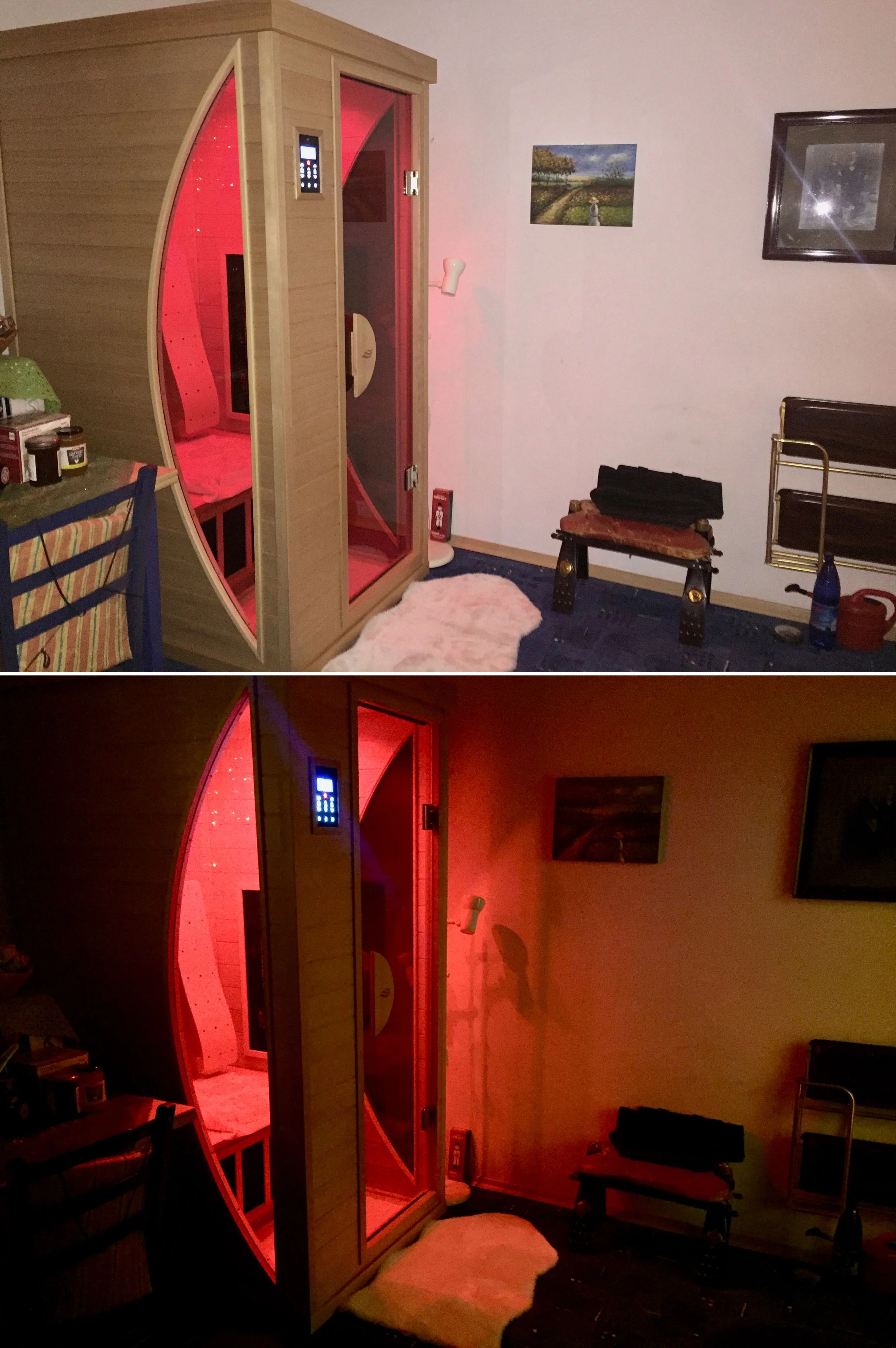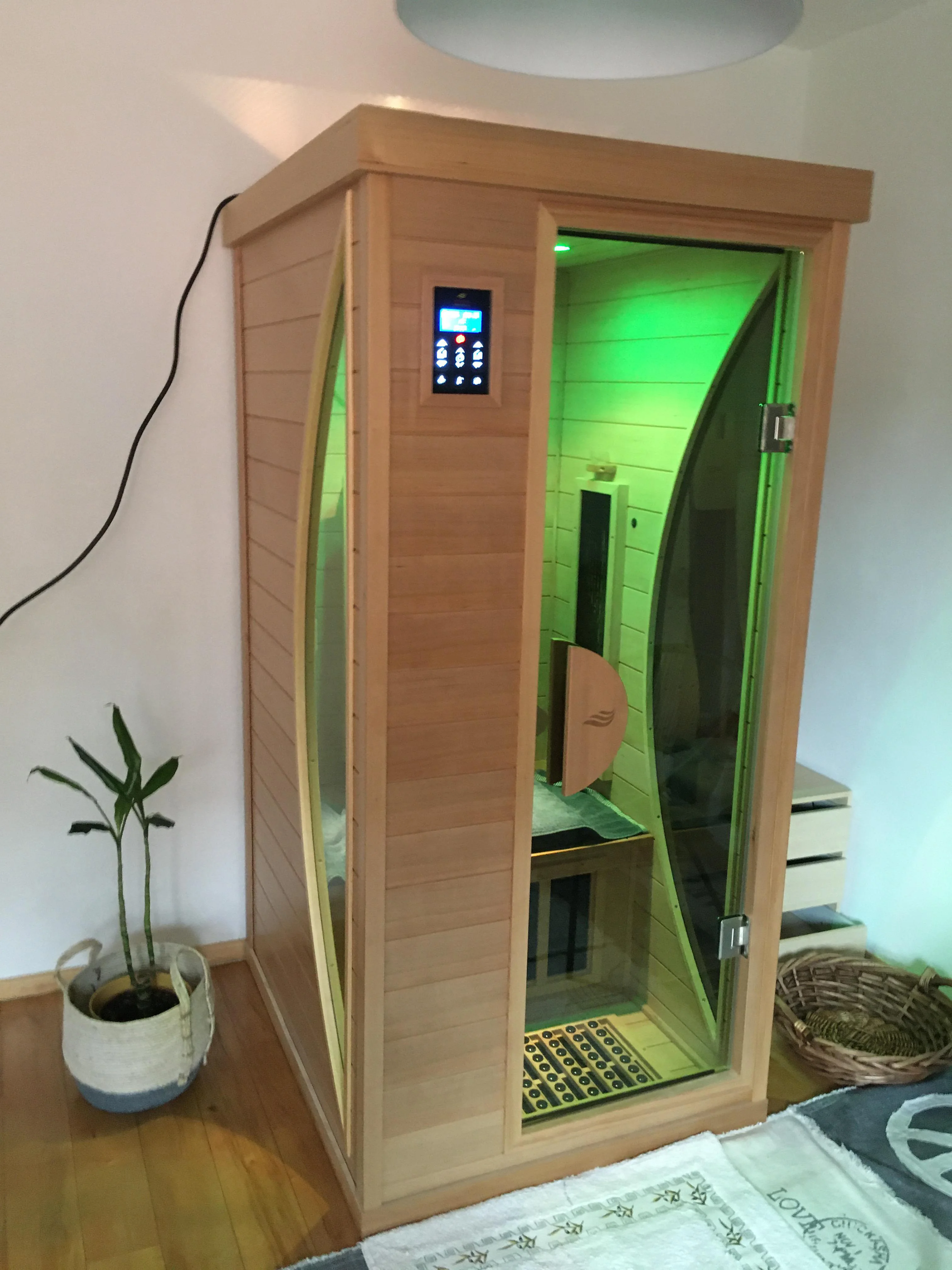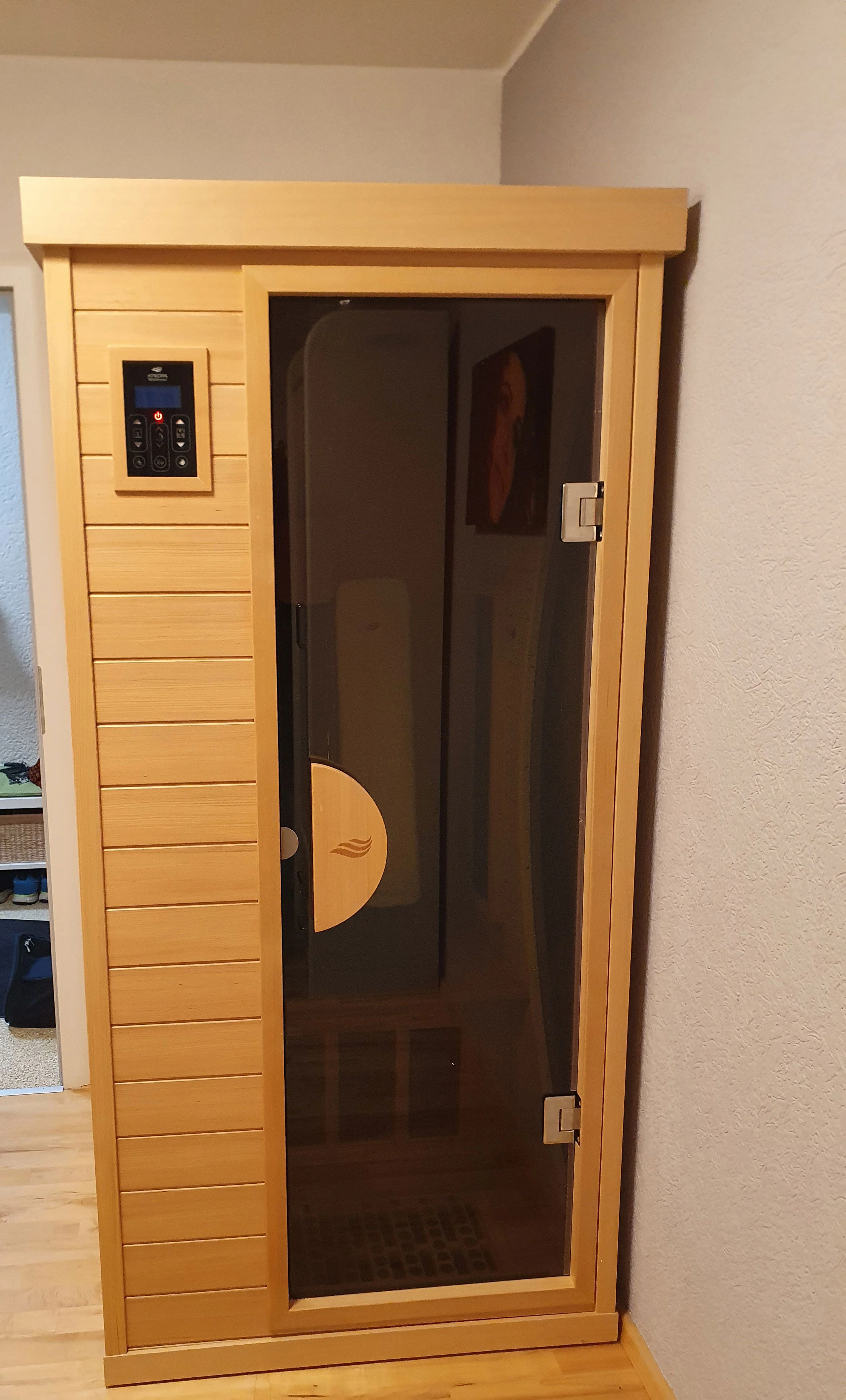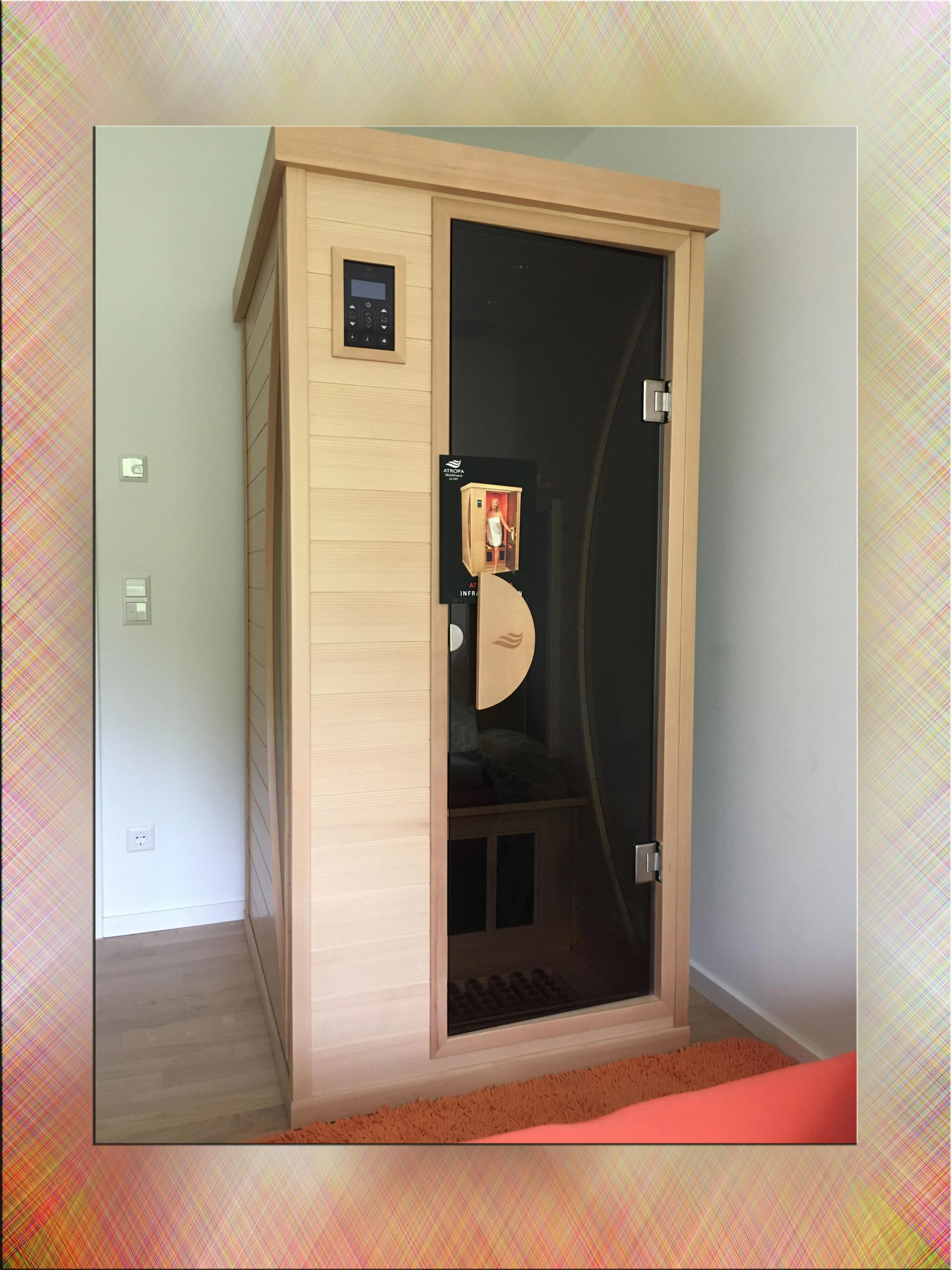 Letztes Jahr im Urlaub setzte ich mich in einem Wellnesshotel nach einem nasskalten Tag in eine Wärmekabine. Das war für mich eine sehr angenehme Erfahrung sodass ich mir die Marke dieser Kabine merkte und danach suchte und schließlich auch bestellte. Der einfache Aufbau gelang mit meinem Mann innerhalb 3 Stunden.