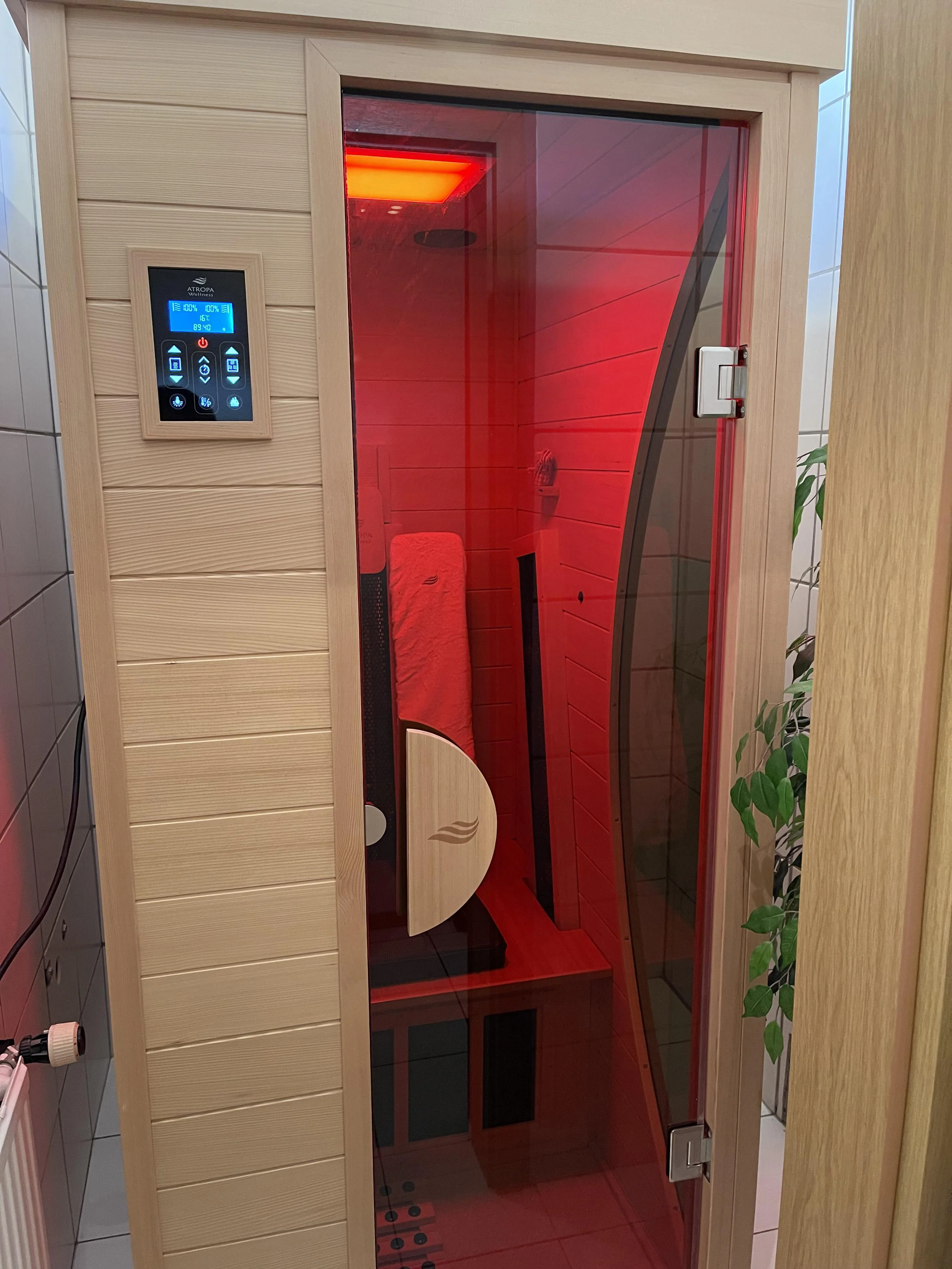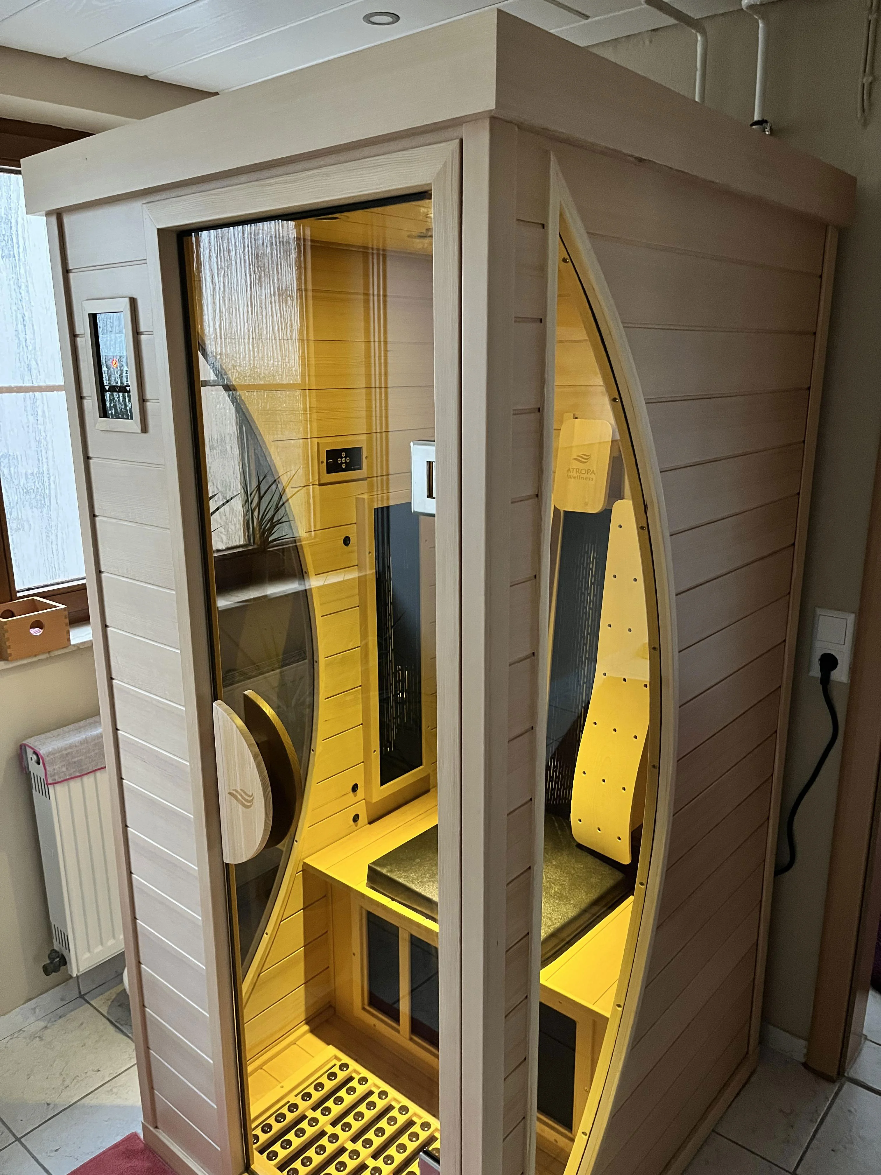 Unsere erste Infrarotkabine 🤗 Dank Internet und Bekannten kamen wir zu Atropa 😇 Gute übersichtliche Websitegestaltung ( Produktmodelle , Fotos, PDF Anleitungen/ Beschreibungen, Videos )um für sich das richtige Modell zu finden . Für uns ATS1👍🏼 Made in Austria was unserer Entscheidung in Punkto Vertrauen sehr entgegen kam. Bestellung online und am nächsten Tag wurde man angerufen um weiteres zu besprechen zu können durch sehr nettes Personal 👍🏼 dann nur noch whatsapp 👍🏼Super einfach . Mitte Dezember 21 bestellt Lieferung bis ca Ende Januar 22 geliefert wurde sie am 10.12 👻 Eine Europalette ( genaugenommen2 übereinander) via Dachser geliefert 👍🏼 Super verpackt und verspannt ohne Schäden 👍🏼 Zusammenbau gut und logisch anhand Anleitung erklärt , Schritt für Schritt TOP 👍🏼 Ja 2 Personen sollten es schon sein und ein wenig handwerkliches Geschick macht Sinn ca 2,5 Std und an die Steckdose 👻 es funktioniert 👍🏼 Musikanlage via Bluetooth an mit entspannender Musik in guter Qualität 😇 Bedienelemente Kabine laut Beschreibung logisch 👍🏼 Wir testeten das Programm P3 25 min Revitalisierung zum Anfang sehr angenehm, wohltuend und für meine Gelenke eine Wohltat 🥰 Beleuchtung Farbauswahl für mich das dunklere Blau und Augen zu 😂dahinschweben😇 Recht herzlichen Dank an Atropa für ein kleines Wohlfühlparadies ich kann Atropa und seine Infrarotkabinen wärmstens weiterempfehlen 🤗